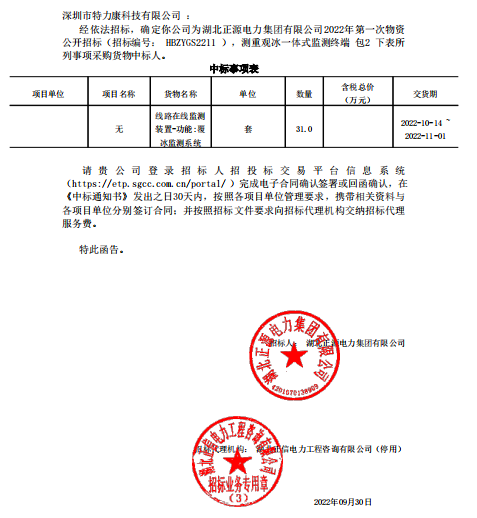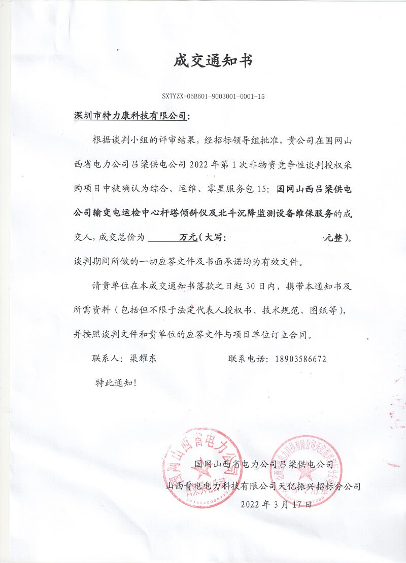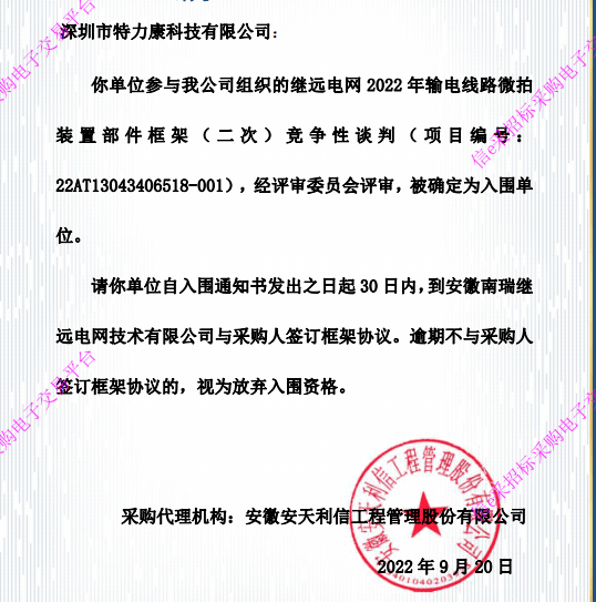 特力康中標國網黑龍江送變電工程公司的2024年度第18次物資類競爭性談判采購項目——慶陽驅鳥器物資框 特力康中標國網甘肅省電力公司省管產業單位2024年第五次物資競爭性談判授權采購項目 中標喜訊:深圳市特力康科技有限公司成功入圍許繼集團綜合能源公司輸電線路視頻在線監測裝置模塊集采項目 中標喜訊:特力康成功中標國網重慶市電力公司渝中一片區項目 特力康成功中標國網天津市電力公司2024年第二次?物?資招標項目 特力康中標國網安徽省電力有限公司蕪湖供電公司2024年3月非物質采購項目 鄂網“全景眼”:特力康一體化視頻監控系統守護輸電線路 山東電網 “穩塔哨兵”:特力康智能桿塔傾斜監測預警裝置筑牢電力桿塔安全防線 特力康科技輸電線路高清圖像監控裝置,為河南輸電通道筑牢安全屏障 黃土高原護塔穩:特力康傾斜監測裝置為山西電網筑牢根基 黔山冰防線:特力康 “數據 + 圖像” 雙監測守護貴州輸電線路 戈壁林區的 “火情哨兵”:特力康紅外熱成像裝置守護甘肅輸電線路 內蒙電網裝上 “舞動監測眼”:特力康輸電線路防舞動監測系統守護線路安全 浙江電力裝上“氣象哨兵”:特力康裝置守護電網應對臺風暴雨 蜀道巡線不用“爬”:特力康視頻在線監測裝置守護四川輸電鐵塔 風雪中的 “防冰哨兵”:內蒙古電力用特力康監測系統筑牢覆冰防線 雙軸感知護塔穩:山西電力用特力康裝置破解采空區傾斜難題 寧夏配電線路安裝了我司防外破電子化智能警示牌