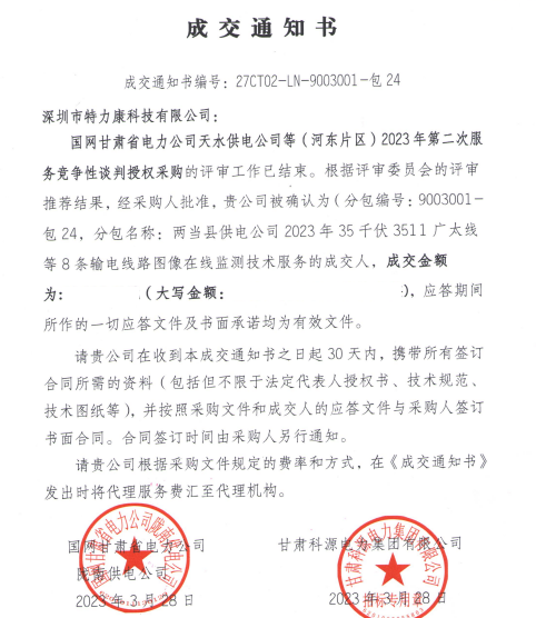 國網甘肅省電力公司天水供電公司等(河東片區) 2023年第二次服務競爭性談判授權采購的評審工作已結束。根據評審委員會的評審推薦結果,經采購人批準,我司被確認為(分包編號: 9003001-包24,分包名稱:兩當縣供電公司2023年35千伏3511廣太線等8條輸電線路圖像在線監測技術服務的成交人,成交通知如下: