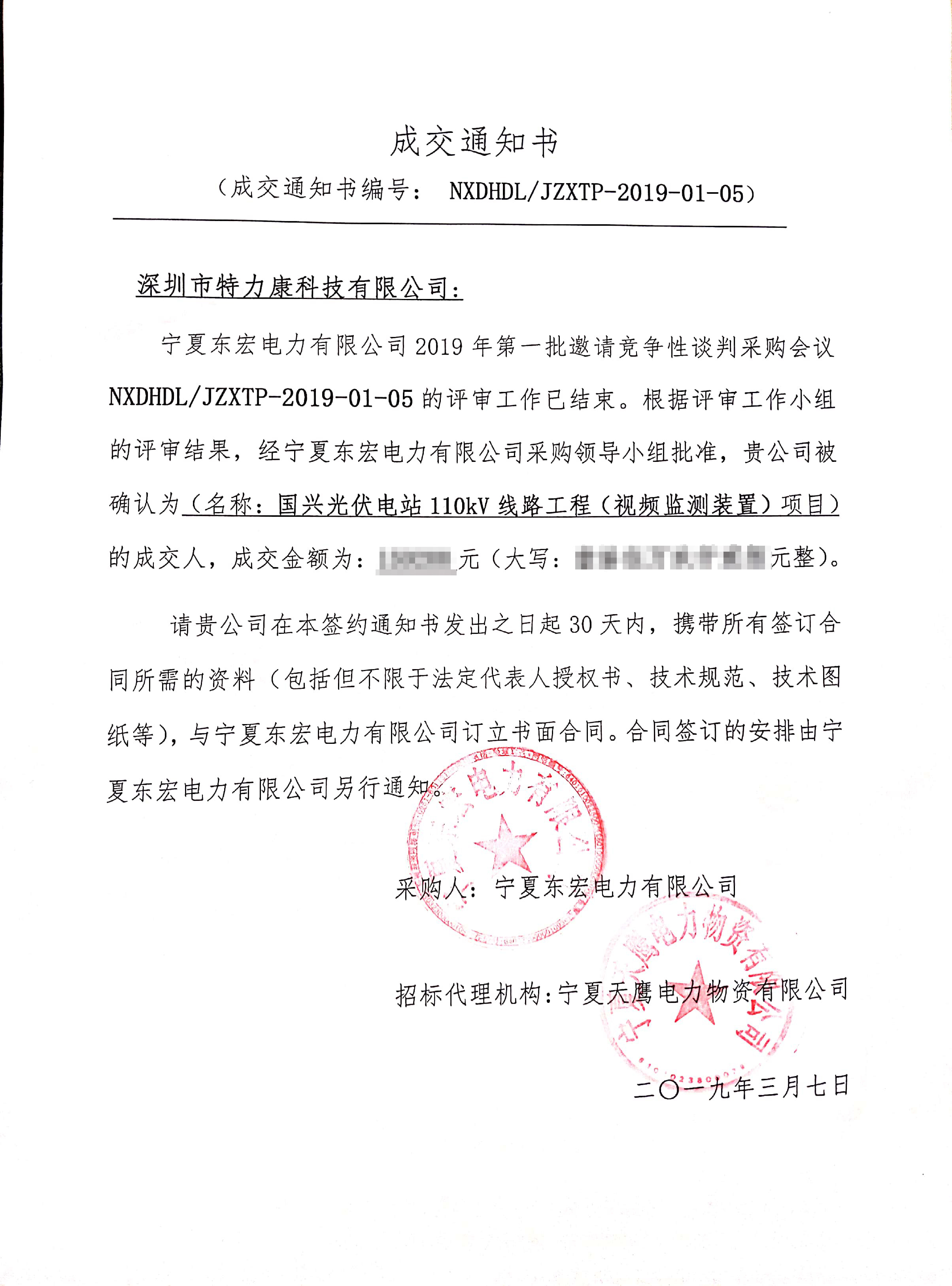 我司中標寧夏東宏電力公司2019年第一批邀請競爭性談判采購項目