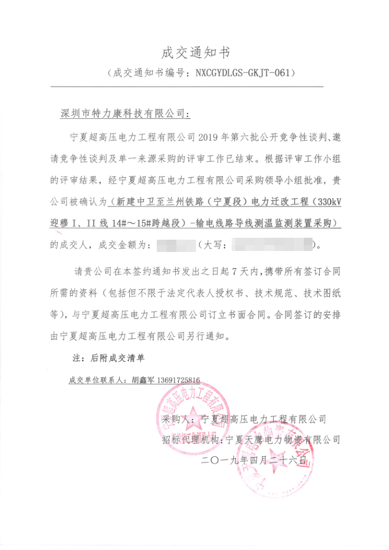 我司中標寧夏超高壓局2019年第六批公開競爭性談判電力遷改項目