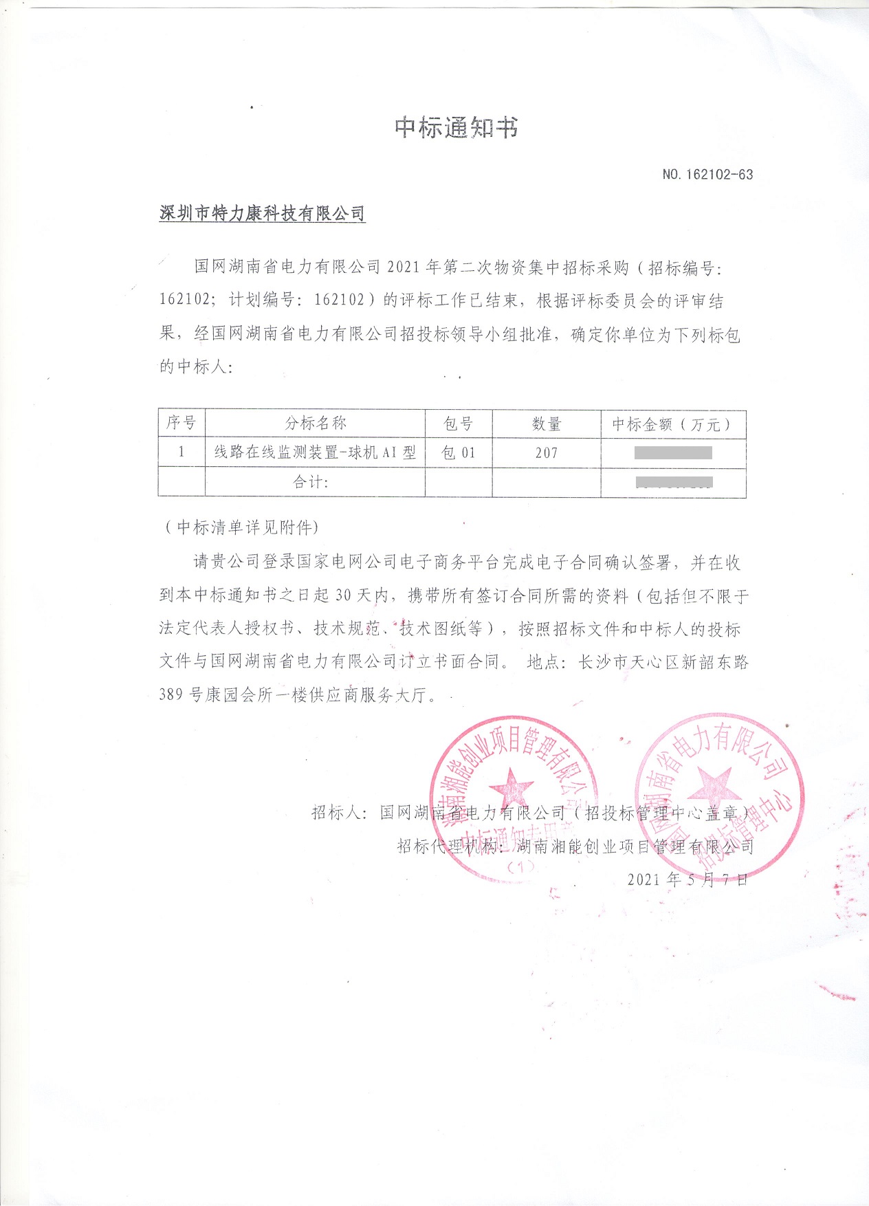 國網(wǎng)湖南省電力有限公司2021年第二次物資集中招標采購(招標編號:162102;計劃編號: 162102) 的評標工作已結(jié)束,根據(jù)評標委員會的評審結(jié)果,經(jīng)國網(wǎng)湖南省電力有限公司招投標領(lǐng)導小組批準,確定我司為線路在線監(jiān)測裝置-球機AI型標包的中標人,中標通知如下: