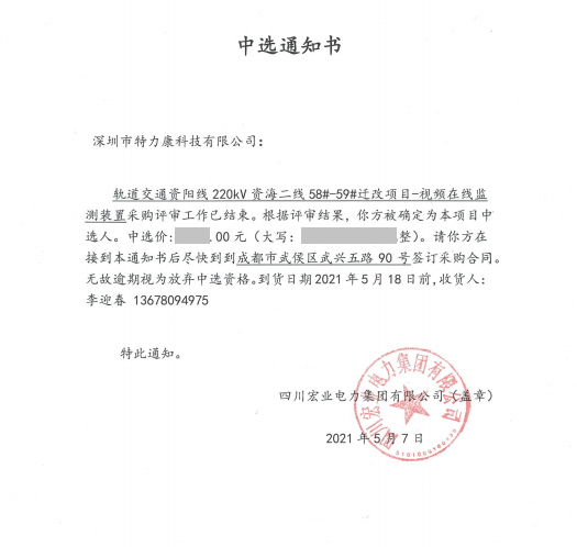軌道交通資陽線220kV資海二線58#- 59#遷改項目一視頻在線監測裝置采購評審工作已結束。根據評審結果,我司被確定為本項目中標人,中標通知如下: