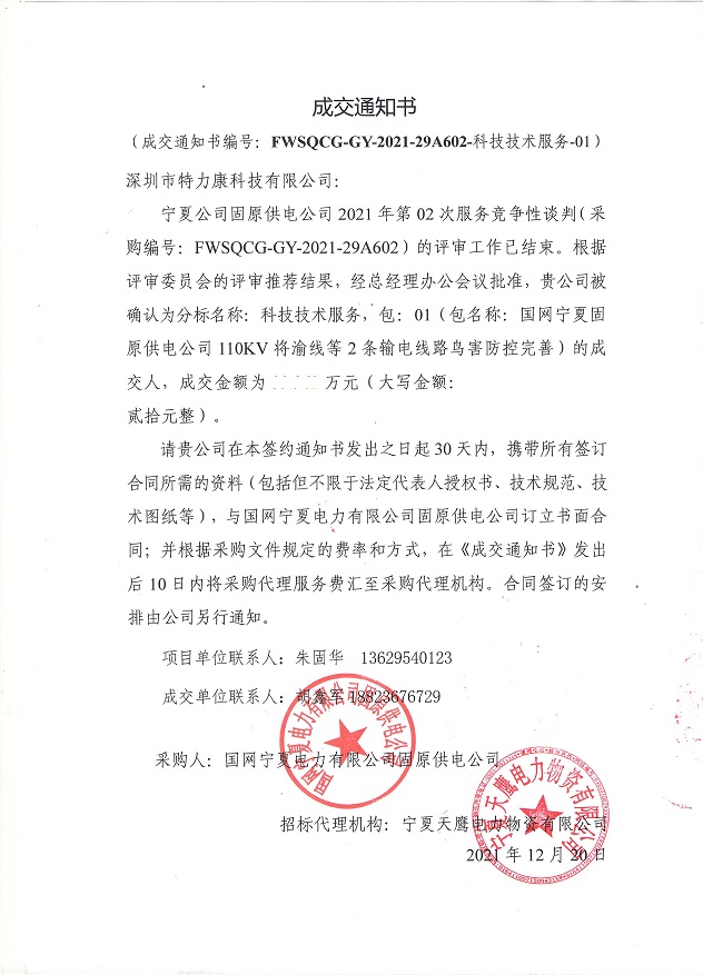 寧夏公司固原供電公司2021年第02次服務競爭性談判(采購編號: FWSQCG-GY-2021-29A602) 的評審工作已結(jié)束。根據(jù)評審委員會的評審推薦結(jié)果,經(jīng)總經(jīng)理辦公會議批準,貴公司被確認為分標名稱:科技技術服務,包: 01 (包名稱:國網(wǎng)寧夏固原供電公司110KV將渝線等2條輸電線路鳥害防控完善)的成交人,成交通知如下: