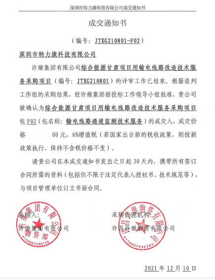 許繼集團(tuán)有限公司綜合能源甘肅項目用輸電線路改造技術(shù)服務(wù)采購項且(編號: JTXG210801) 的評審工作已結(jié)束。根據(jù)談判工作組的采購結(jié)果,經(jīng)許北集團(tuán)招投標(biāo)工作領(lǐng)導(dǎo)小組批準(zhǔn)。我司被確認(rèn)為綜合能源甘肅項目用輸電線路改造技術(shù)服務(wù)采購項目包F02(包名稱:輸電線路通道監(jiān)測技術(shù)服務(wù))的成交人,成交通知如下: